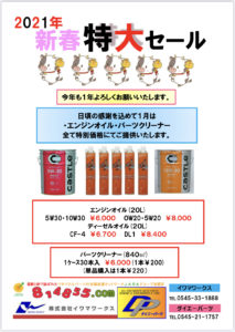 1月キャンペーン2021 新年明けましておめでとうございます^ ^ 今年も宜しくお願い致します(^^) 新年初めのキャンペーン商品は、エンジンオイルとパーツクリーナーの2商品になります(^^) どちらも特別価格でお買い求めいただけます^ ^ 宜しくお願い致しますm(_ _)m