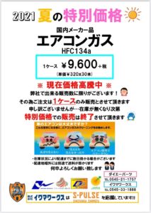 7月キャンペーン2021 今月のキャンペーン商品は、エアコンガス(HFC134a)になります(^^) 本格的な暑さを迎える前にエアコンの点検をお勧めします(^-^) 人気商品につき、今回、数に限りがございますのでお求めの方は、お早めにご依頼いただければと思います m(_ _)m 宜しくお願い致します^ ^